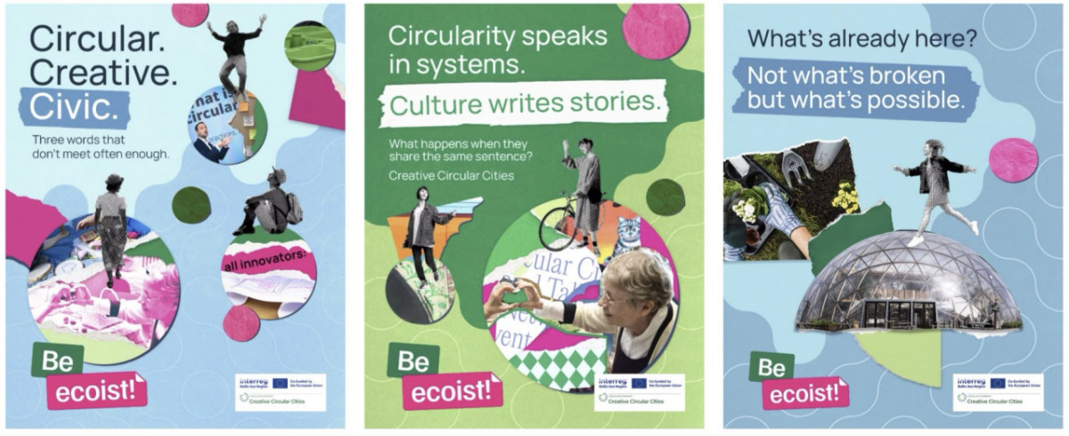 Un exemplu foarte bun aici e limbajul vizual pe care l-am construit pentru Creative Circular Cities, un proiect european Interreg care pilotează în 6 orașe baltice mixul dintre circularitate și creativitate aplicată. Brieful a fost o metodă eficientă de a crea peste 100 de asset-uri de social media. Și am făcut asta reciclând și refolosind toate materialele vizuale ale proiectului - de la grafică la fotografie de eveniment și ilustrație, totul sub o identitate vizuală deja stabilită, cumva practicing și în identitatea vizuală what the project preaches.