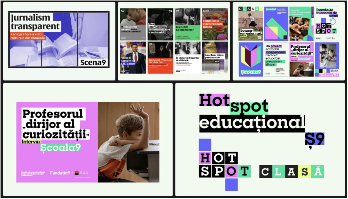 Dan: Un brand destul de coerent și accesibil construit încât să funcționeze bine și ușor pe toate mediile, pentru toate pretextele de comunicare și utilizat eficient de orice designer, intern sau extern care lucrează cu brandul și regulile lui. Am exersat asta foarte mult pe brandurile Fundația9, Rezidența9, Școala9 și Scena9, oameni, publicuri, idei, contexte diferite.
