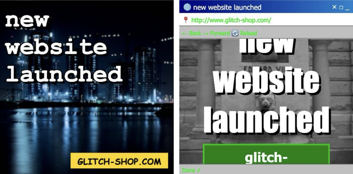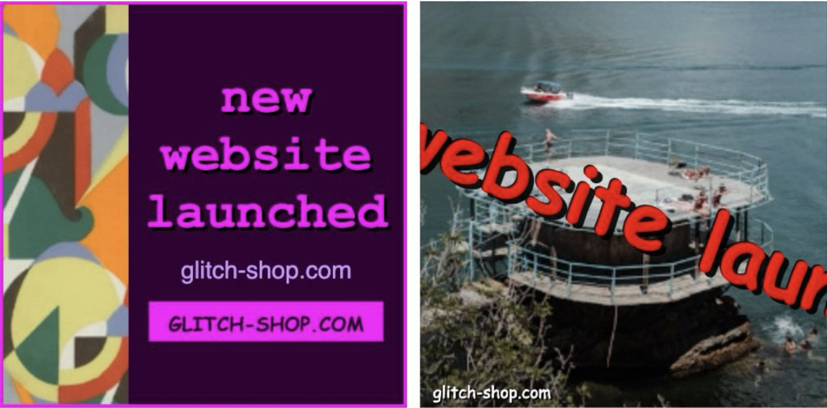 (serie de bannere executate programatic de un un cod AI în stilul bannerelor din anii 2000 pentru lansarea website-ului nou glitch)