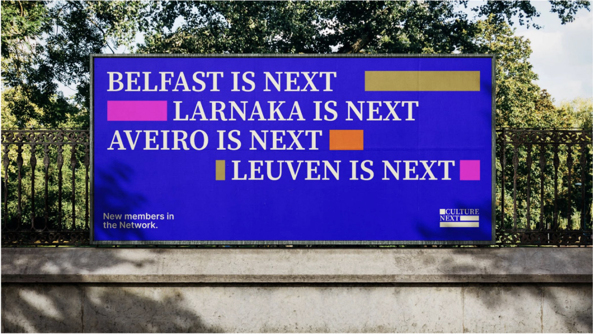 Un alt exemplu, este rebrandingul Culture Next, o organizație internațională de foste sau viitoare capitale culturale, o identitate care trebuie să funcționeze pentru zecile de orașe din organizație (în identitate fiecare primește o variantă proprie de steag/logo), să rămână coerentă și să se poată exprima atât în offline la conferințe cât și în online la diverse pretexte.