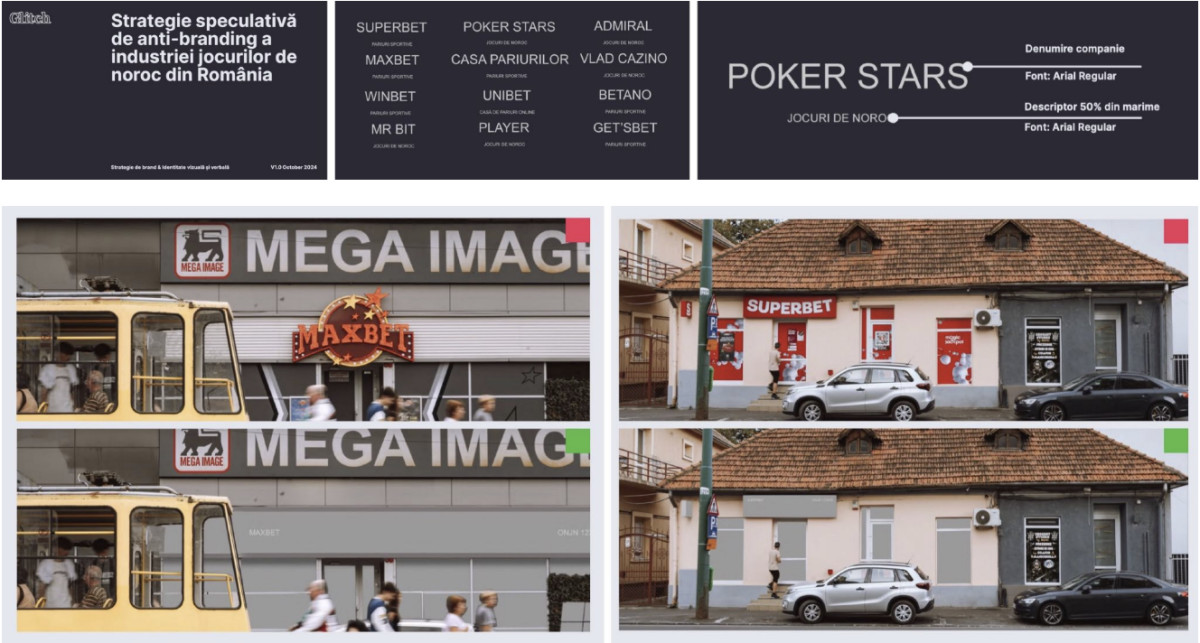 Dar apropo de putere, poate exemplul cel mai interesant din activitatea glitch din ultimii ani este anti-identitatea speculativă pe care am gândit-o pentru a de-branda industria jocurilor de noroc din România. E exercițiul invers de a vedea care poate fi puterea brandingului de a dezamorsa efectul pe care îl are o industrie care distruge vieți. S-a născut astfel o identitate care nivelează wordmarks, ascunde logouri, desaturează până la gri toată imagistica și anulează identitățile atât de atent construite ale tuturor actorilor din industrie, făcându-le la fel și disipând puterea de atracție.