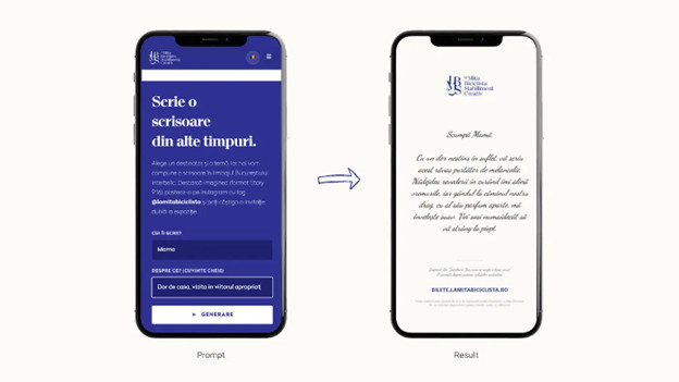 Poate introduce un subiect, un destinatar și poate genera un text care îl plasează direct în universul expoziției. Interacțiunea durează mai mult decât un scroll, iar atenția este investită, nu doar captată.