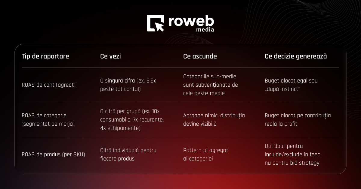 Mai există un strat al aceleiași probleme, mai puțîn discutat și aproape niciodată corectat: majoritatea retailerilor evaluați continuă să se raporteze la un ROAS general, agregat la nivel de cont. Cifra arată curată în dashboard, dar este o medie aritmetică între categorii cu marje, tipare de cumpărare și roluri in funnel complet diferite. ROAS-ul de cont nu spune nimic despre profitabilitatea reală, pentru că ascunde exact distribuția din care se construiește profitul.