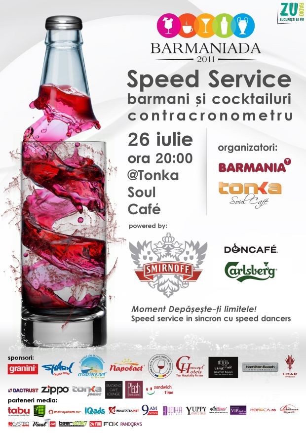 Etapa de Speed Service din cadrul BARMANIADA, cea mai complexa competitie anuala de bartending din Romania, reuneste cei mai rapizi barmani din toata tara si inseamna proba in care sase cocktailuri si doua sticle de bere trebuie servite in cel mai scurt timp. Din juriu vor face parte barmani si traineri de renume mondial, membri ai IBA (International Bartenders Association) si WFA (World Flair Association).