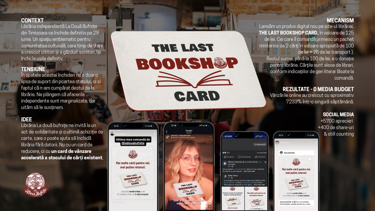 Eu sunt Lorena Enache, copy la Digitas. Alături de jumătatea mea artă, Cristina Gheorghe, am făcut o schemă de marketing pentru Librăria La două Bufnițe din Timișoara.