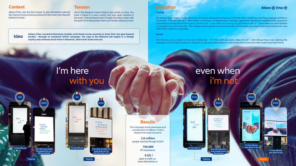 The full story was unveiled on the same billboards – “I’m here with you, even when I’m not” - with Allianz-Țiriac now claiming the message and inviting Romanians in diaspora to visit allianztiriac.ro and choose an insurance for their loved ones back home.